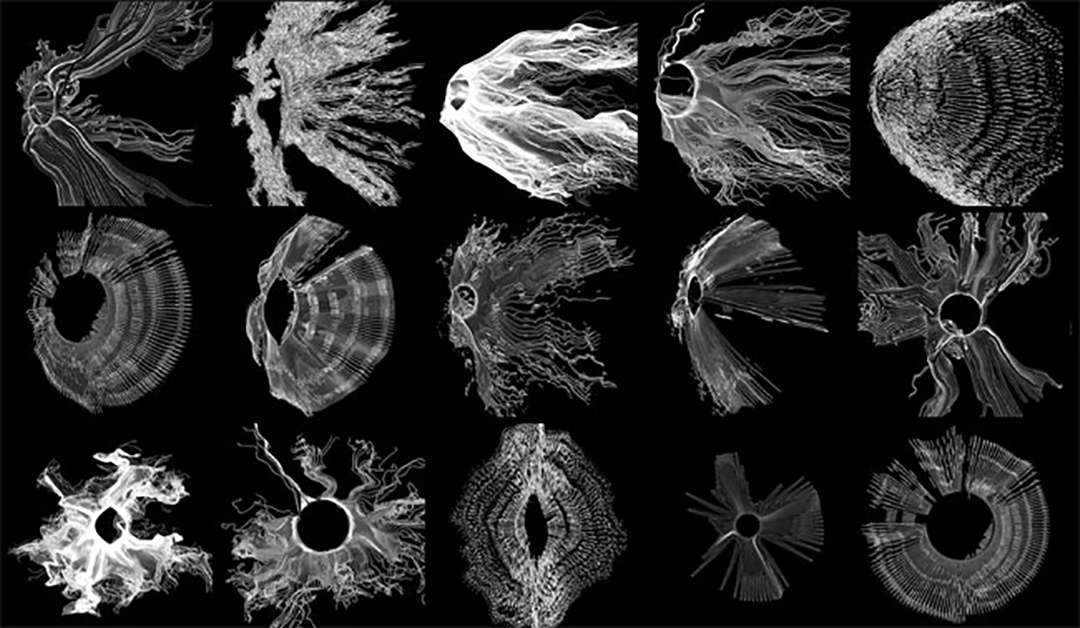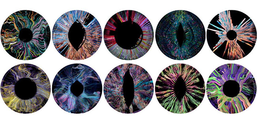 藝術(shù)家們創(chuàng)作的一系列數(shù)字雕塑為這一身份火上澆油。當(dāng)從正面看時(shí),這些雕塑被設(shè)計(jì)成類似于一系列復(fù)雜的精細(xì)肌肉,這些肌肉的膨脹和收縮構(gòu)成了生物眼睛的虹膜。數(shù)據(jù)隨機(jī)化,給出了無限多的虹膜設(shè)計(jì)。
