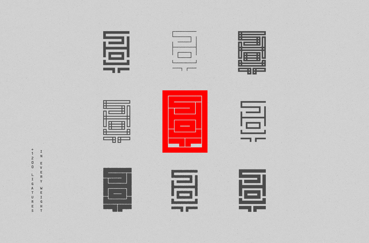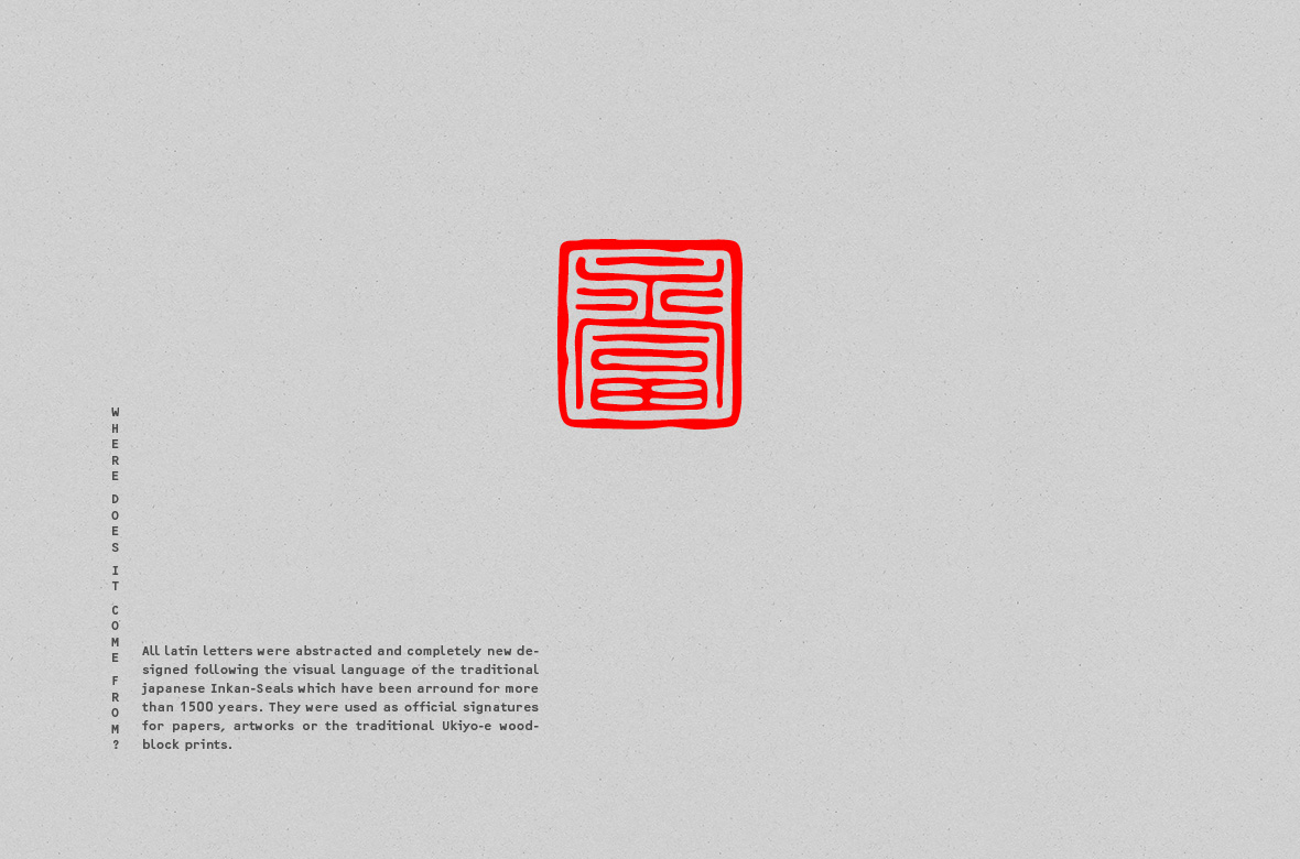 Nihon字體作為一個在德國奧芬巴赫HfG的Sascha Lobe字體類別中自行發(fā)起的項目。由于我對日本平面設計和哮喘有著濃厚的興趣,我的研究將我引向了傳統(tǒng)的Ukio es。17世紀早期的木刻版畫。一般來說,這些版畫是由藝術家們用他們的個人印章簽名的。印加海豹。漂亮的裝飾性印刷杰作,但可悲的是,如果你不會說日語,就無法閱讀。我的想法是,將所有拉丁字母按照傳統(tǒng)印加印章的視覺語言進行抽象和全新的設計。目標是,用你的語言書寫,卻有著美麗的日文印加印章的外觀。經(jīng)過幾個月的構思、設計和幾個晚上的睡眠,第一個Nihon字體完成了。