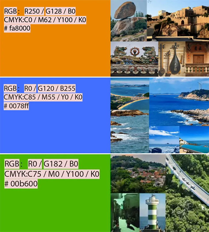 LOGO的色彩由橙色、藍色和綠色三色組成。橙色代表關帝文化。關帝文化在東山島具有深遠影響,象征著忠義、仁愛與守護。橙色代表熱情、活力與傳承,呼應關帝文化與當?shù)厝宋那閼训纳詈竦滋N。