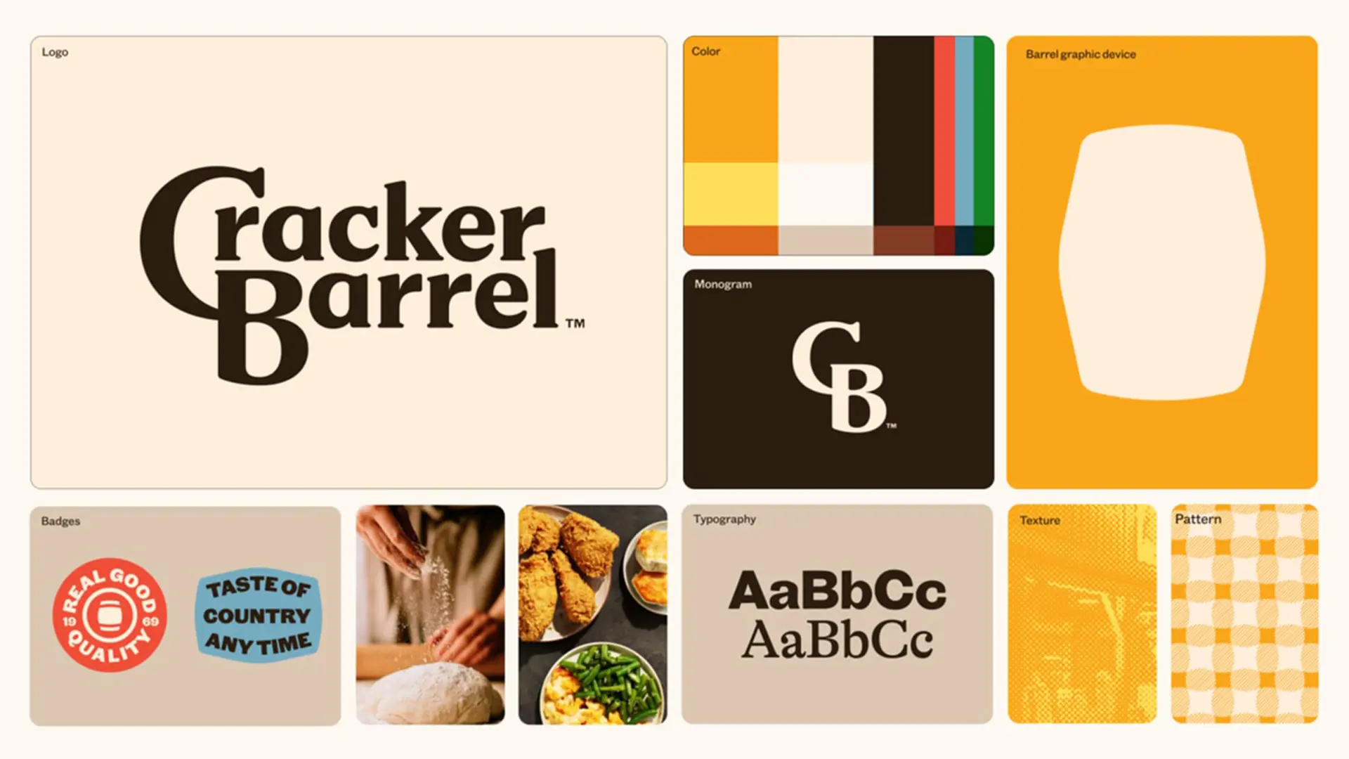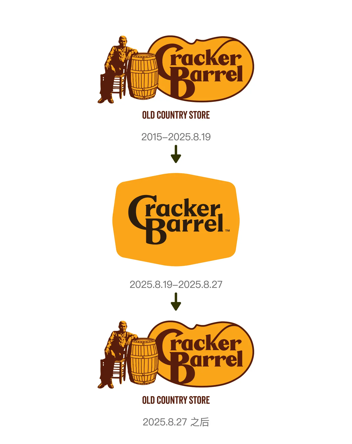 8月19日,Cracker Barrel啟動(dòng)了一項(xiàng)規(guī)模達(dá)7億美元的品牌升級(jí)計(jì)劃,內(nèi)容涵蓋更換標(biāo)志、更新菜單與調(diào)整門店裝修風(fēng)格。其中,新標(biāo)志的設(shè)計(jì)引發(fā)了廣泛爭議——它舍棄了餐廳沿用多年的經(jīng)典人物形象,轉(zhuǎn)而采用更為簡潔的純文字樣式。這一改動(dòng)讓眾多老顧客難以接受,直接導(dǎo)致餐廳股價(jià)應(yīng)聲暴跌12%,詳細(xì)閱上一篇文章:知名連鎖店餐廳Cracker Barrel更新了品牌設(shè)計(jì)