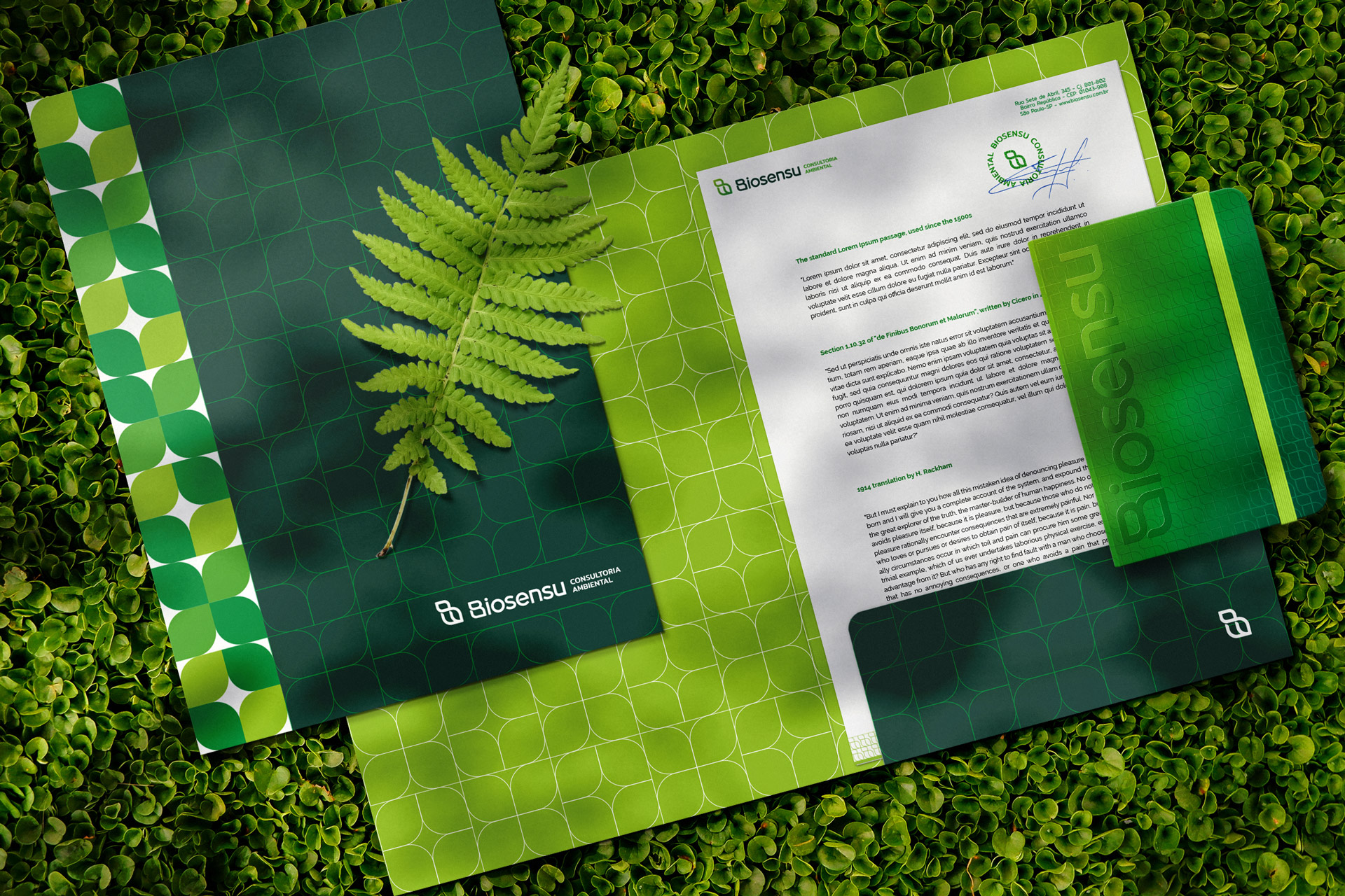 標(biāo)識設(shè)計中需要呈現(xiàn)的屬性是:現(xiàn)代、系列、精致和有機(jī),并且還要求使用綠色(最終分解為具有各種深淺綠色的彩色調(diào)色板)。品牌形象設(shè)計是設(shè)計一個具有足夠強(qiáng)烈個性的符號和排版,可以一起使用或單獨使用,此外,還可以從美學(xué)角度參考該公司的細(xì)分市場:環(huán)境咨詢/自然/樹葉。該標(biāo)志設(shè)計源于葉子+字母B(公司的首字母)的設(shè)計,具有有機(jī)的美學(xué)和顯著的特征,即一些圓滿的結(jié)尾,而另一些則更直。這一特點激發(fā)了排版設(shè)計的靈感,這是一種專為e Biosensu設(shè)計的無襯線字體,具有足夠的個性,可以在沒有符號的情況下使用。同樣的視覺特征也存在于一些文具中,如名片、信封等。