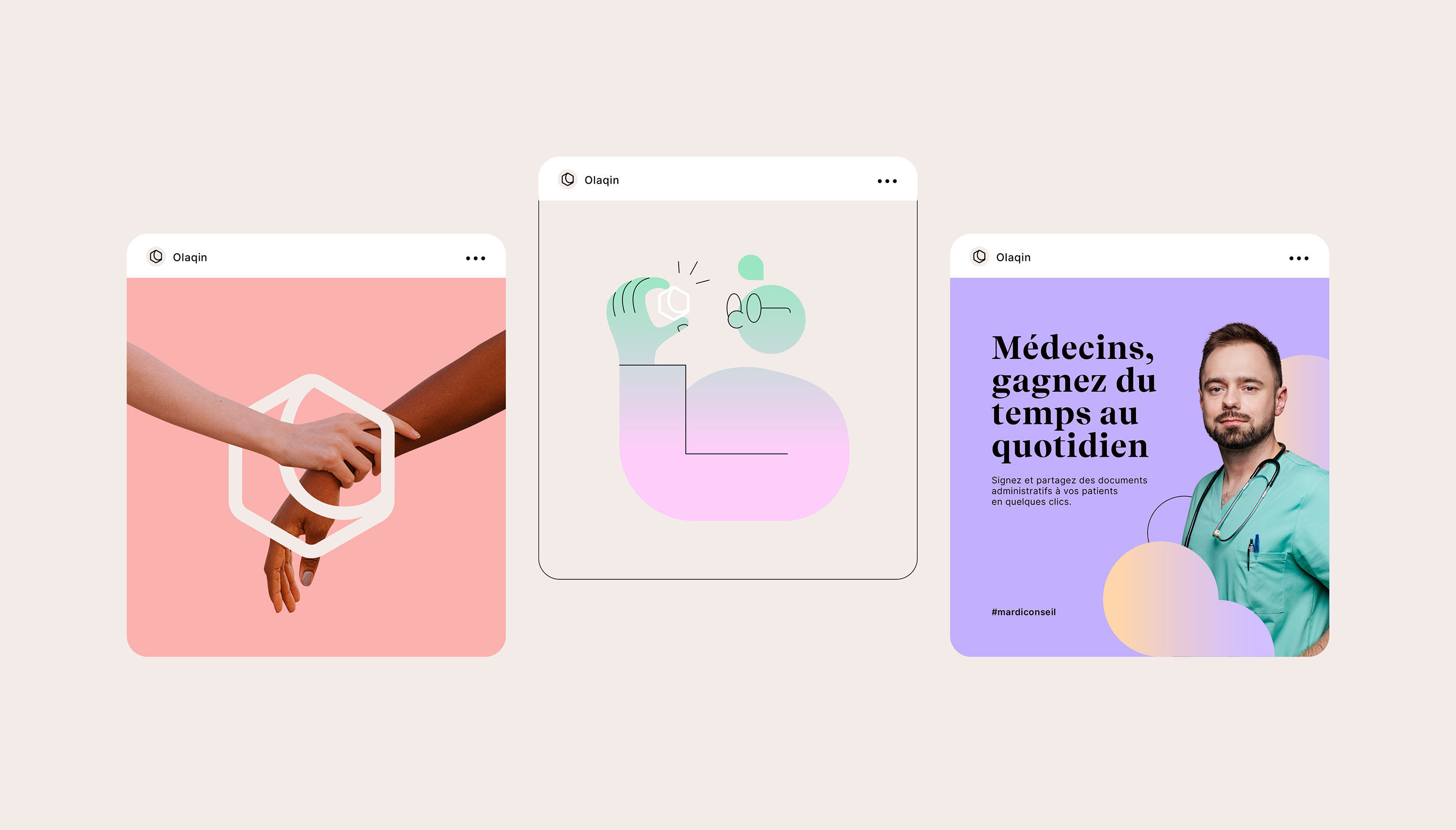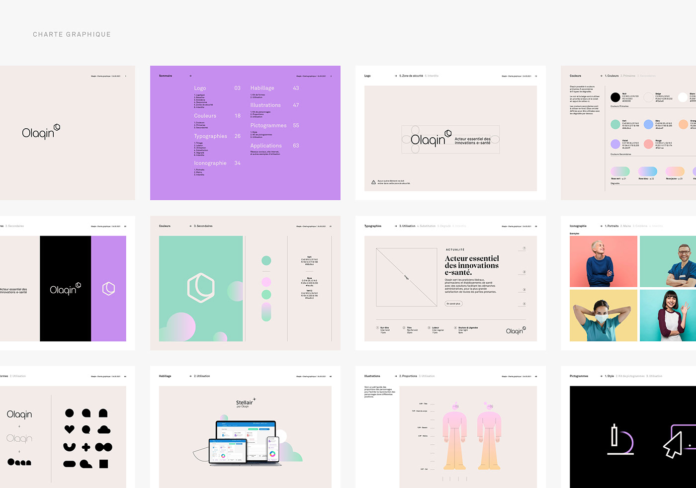 這種形狀詞匯混合了從數(shù)字環(huán)境中提取的醫(yī)學(xué)符號和象形圖,以最好地代表 Olaqin 的業(yè)務(wù)部門。