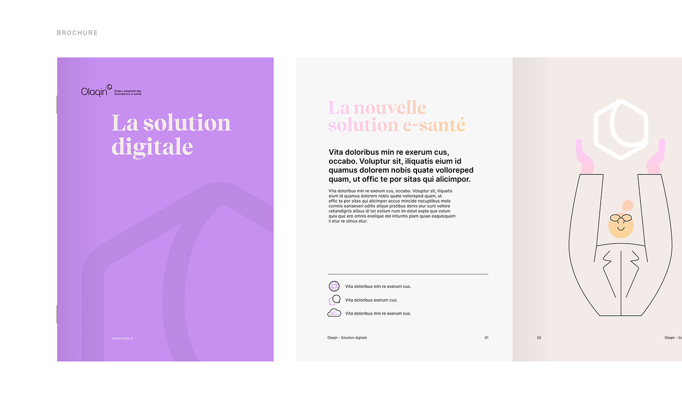 到目前為止,公司指南使用的是從圖像庫中獲取的非個人圖像。新品牌形象設(shè)計的圖像將體現(xiàn)護理和醫(yī)療護理的照片與色彩繽紛、富有詩意的插圖結(jié)合在一起。主要目標(biāo)是提出一個獨特的圖像,傳達為患者和衛(wèi)生專業(yè)人員提供界面服務(wù)的理念。Recif 字體的實線和流暢線條的有機品質(zhì),結(jié)合其襯線的粗糙度,為布局提供了靈活性。這種印刷選擇與通常用于數(shù)字的“無襯線”印刷風(fēng)格形成鮮明對比。這是使品牌人性化的印刷選擇。柔和的色彩環(huán)境對應(yīng)著奧拉欽運作的醫(yī)療宇宙的護理功能。漸變直接喚起了品牌服務(wù)的數(shù)字背景。