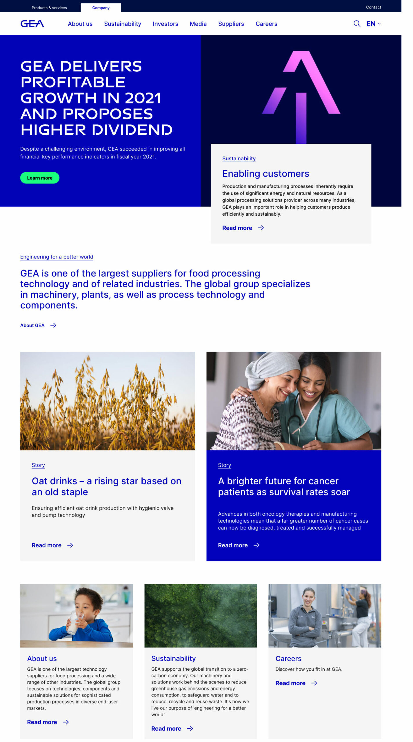 自從作為 GEA 集團出現(xiàn)以來,該公司首次獲得了新的集團標志設(shè)計。藍色和灰色的房屋顏色得到了進一步的發(fā)展,有利于以群青藍為主要顏色,綠色和紫色或紅色為次要顏色的色譜。新的企業(yè)設(shè)計已經(jīng)在 3 月初重新啟動的網(wǎng)站 gea.com 上實施。