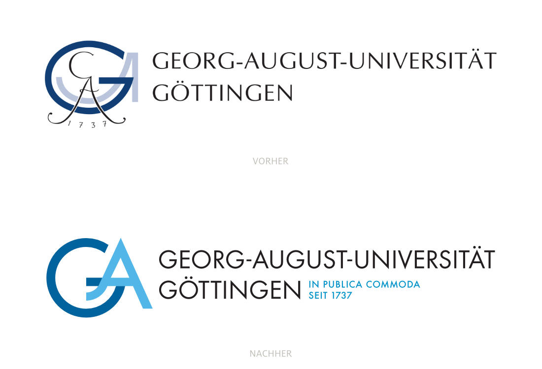 大學(xué)標(biāo)志設(shè)計(由名稱模式“g”和“a”的前幾個字母組成)已經(jīng)過簡化和著色。此操作刪除了書法專題卡和年份1737。單詞標(biāo)記已在字體中-未來重新設(shè)置(到目前為止太好了),但仍保持兩行。標(biāo)志設(shè)計的基本排列、左邊的圖像標(biāo)記、右邊的單詞標(biāo)記都沒有改變。根據(jù)應(yīng)用程序上下文的不同,單詞品牌可以添加“自1737年以來在publica commoda”字樣,這是從創(chuàng)立之時起的指導(dǎo)形象設(shè)計。