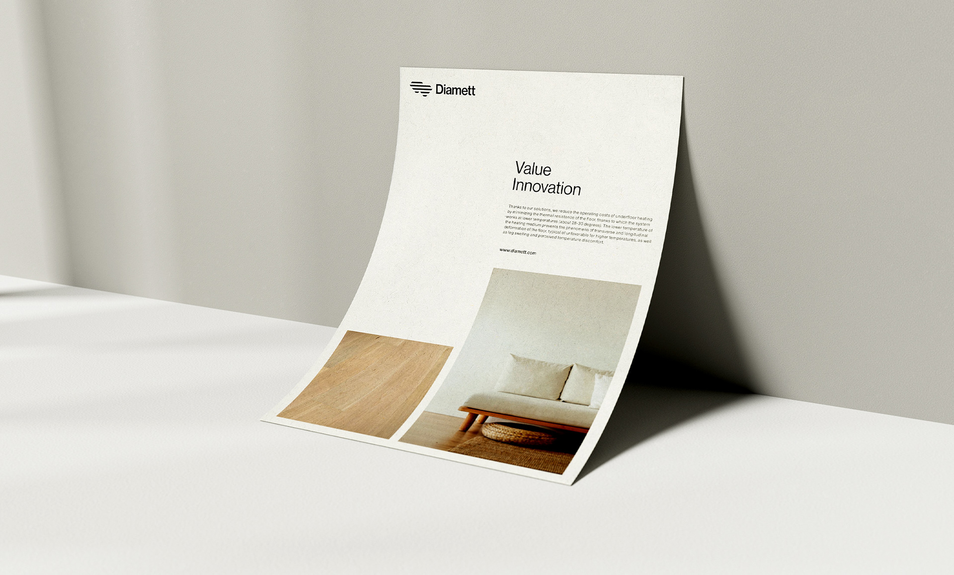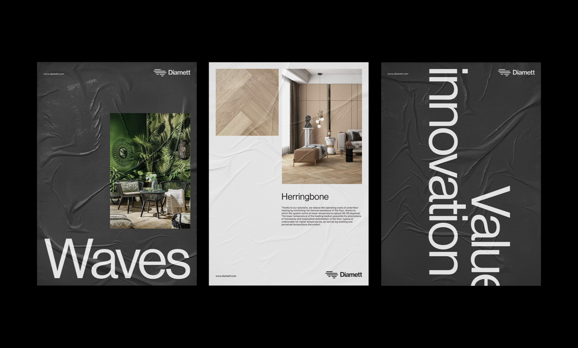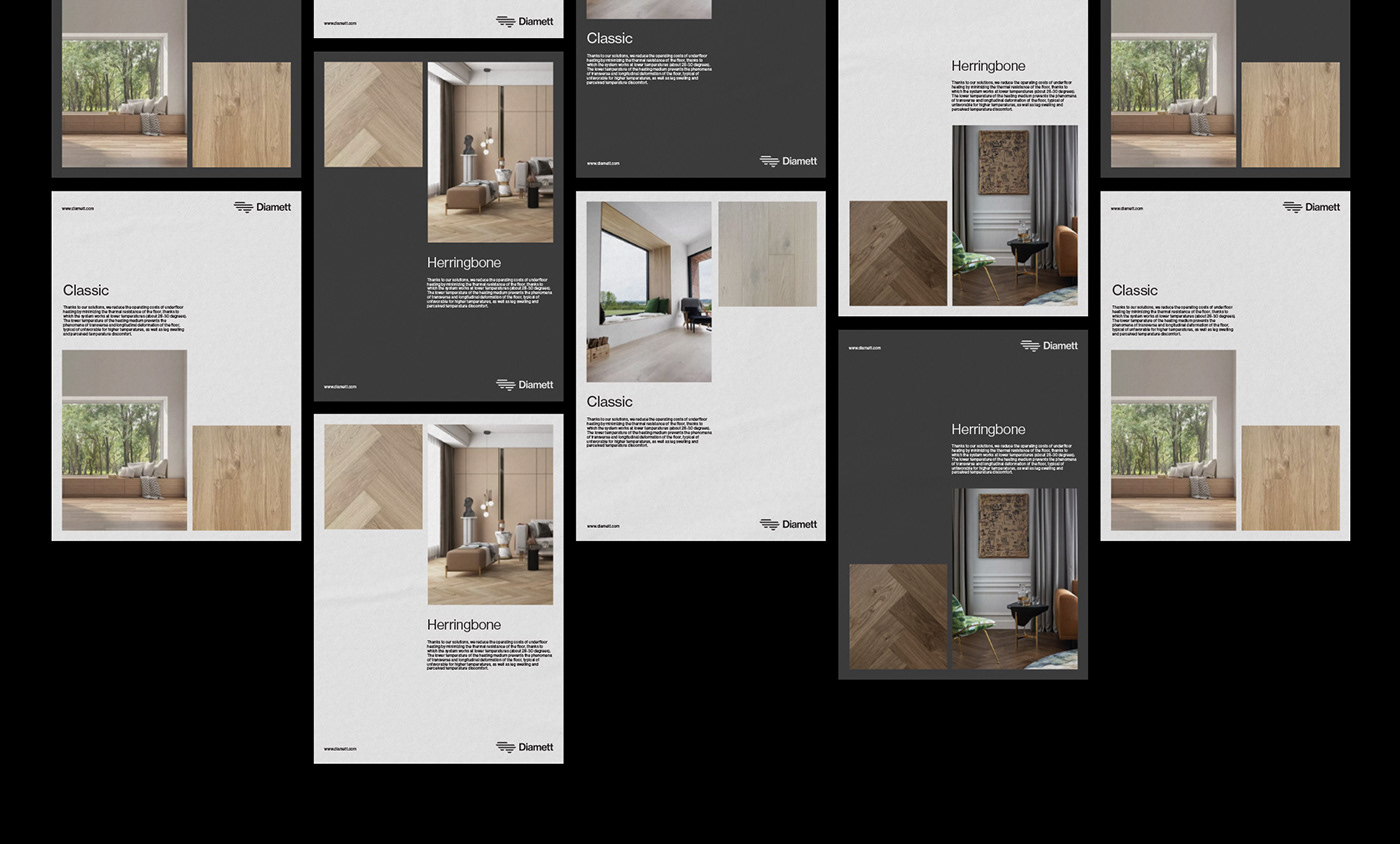 家居行業(yè)Diamett地板制造商品牌設(shè)計(jì):Diamett是一家高端地板制造商,憑借其名為“瑞典板”的專利解決方案,擁有無與倫比的性能。七毫米厚的高密度HDF芯和八層清漆覆蓋在木材單板上,結(jié)果是地板可以承受任何虐待,在顏色和結(jié)構(gòu)上都具有自然的光潔度。該技術(shù)還具有環(huán)保效益,僅使用1/6平方米實(shí)木地板所需的木材,使直徑地板成為可持續(xù)發(fā)展的選擇,而不會(huì)影響質(zhì)量。一個(gè)額外的優(yōu)勢(shì)是地板的導(dǎo)熱率比常規(guī)層壓板高63.5%,這使得地板下供暖更有效,更節(jié)能。