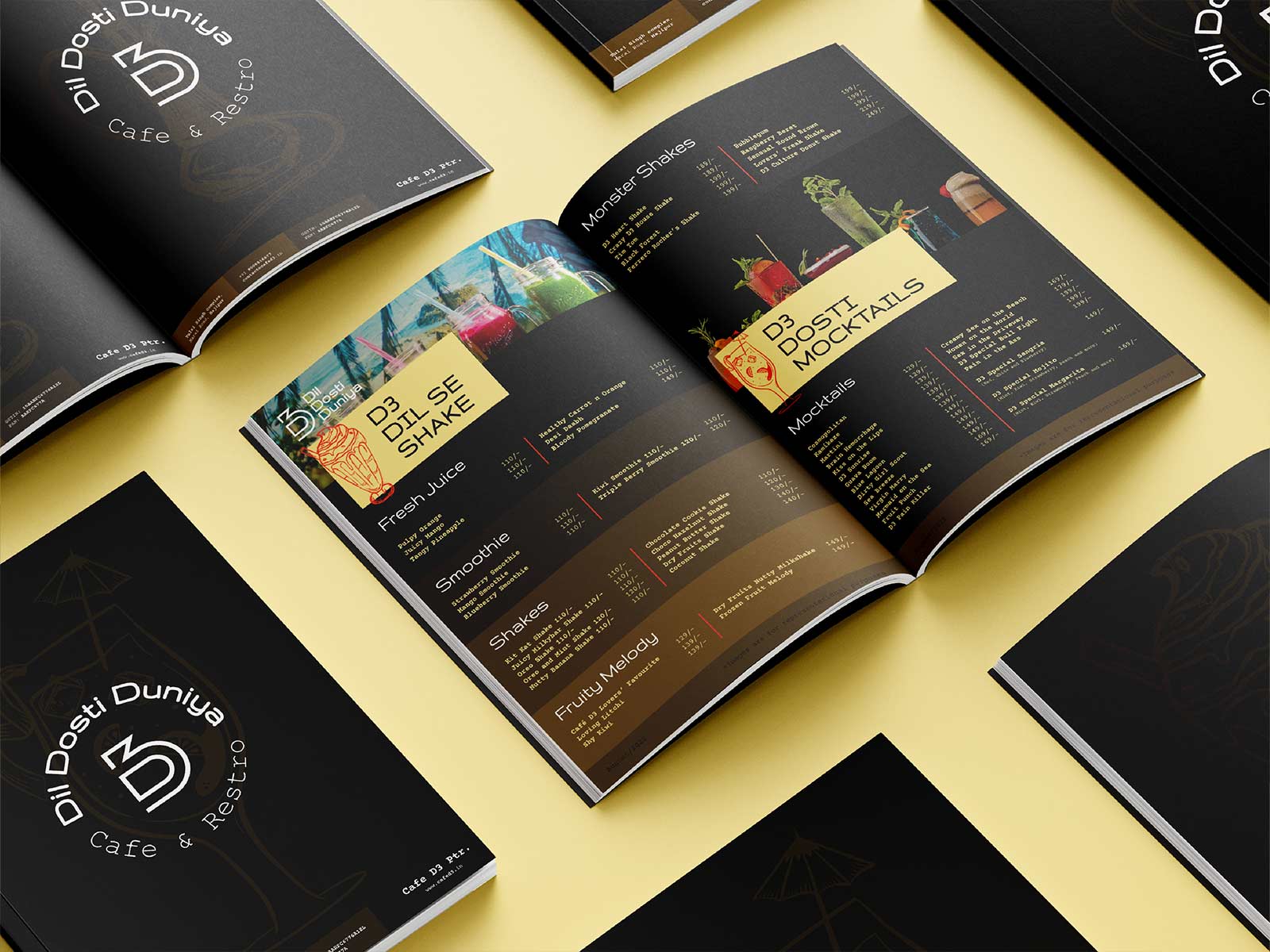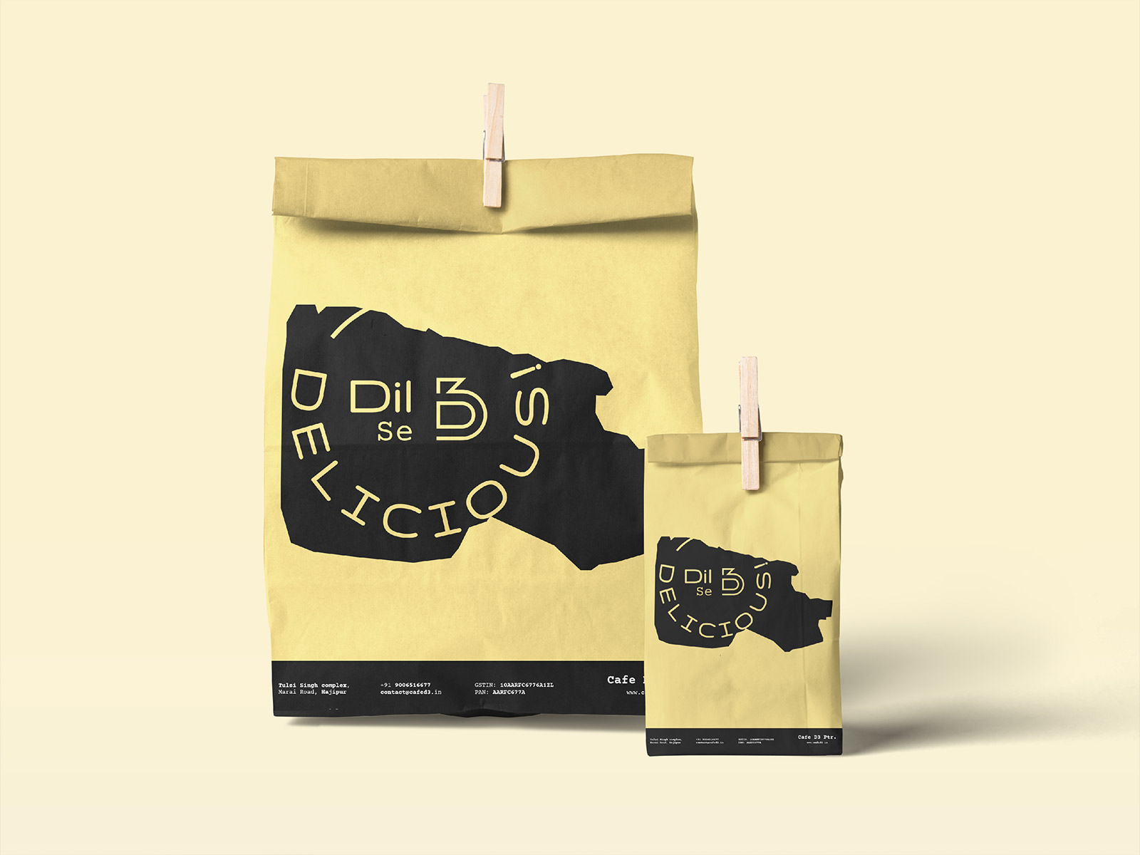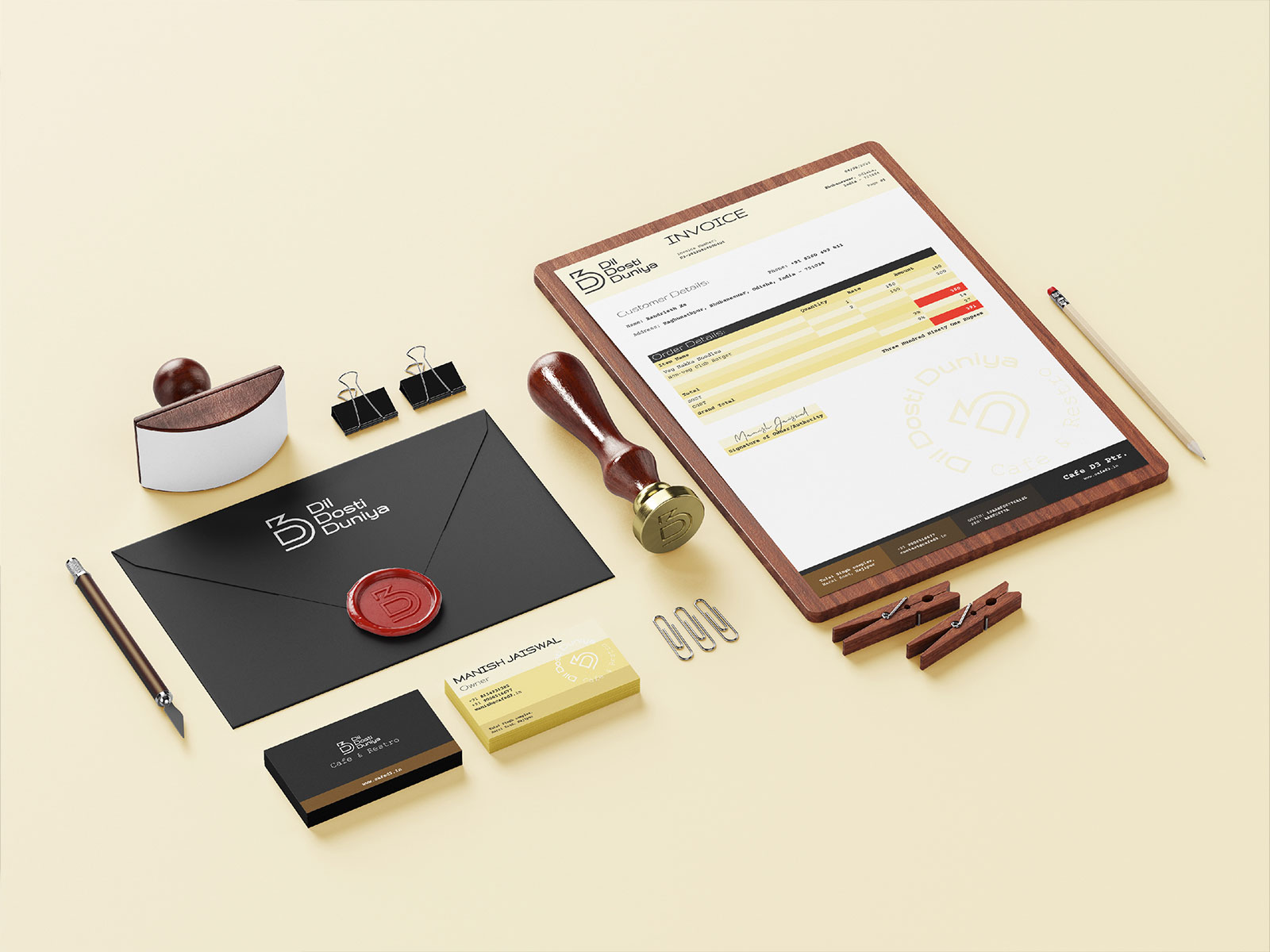 對于將大量印刷的文具,如信箋抬頭和發(fā)票,我們保留白色作為基色。對于名片、信封和邀請函等單幅印刷文具,我們使用 D 黑色和不同色調(diào)的 Dosti 黃色和 Duniya Brown 作為基色的組合。我們采用浮雕印刷技術(shù),結(jié)合紅色徽標印章,提供手工制作的精致用餐體驗。我們進一步使用不同色調(diào)的Dosti Yellow對不同的信息進行分組,同時為文具提供標志性的視覺品牌標識。