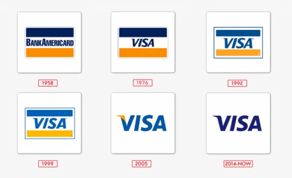 在過去的40年中,品牌的視覺形象沒有太大變化。帶有“Visa”字樣的標志最早出現(xiàn)在20世紀70年代中期,經(jīng)過了一些小的重新設(shè)計。在此之前,也使用了類似的品牌,但帶有“BankAmericard”字樣。1958年至1976年