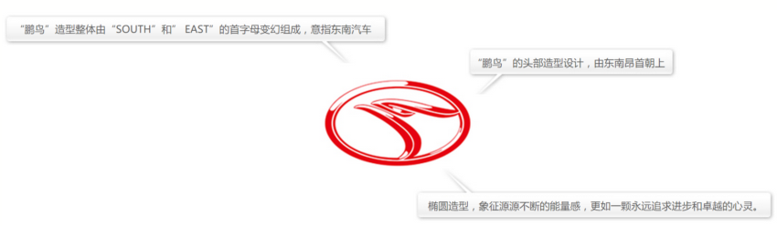 橢圓的形狀象征著源源不斷的能量感,更像是一個永遠追求進步和卓越的靈魂,“鵬鳥”的頭部造型設(shè)計,由東南昂首朝上,表現(xiàn)出振翅欲飛的態(tài)勢,表現(xiàn)出企業(yè)旺盛、強烈的進取心及能力,“鵬鳥”造型整體由“SOUTH”和”EAST”的首字母變幻組成,意指東南汽車。